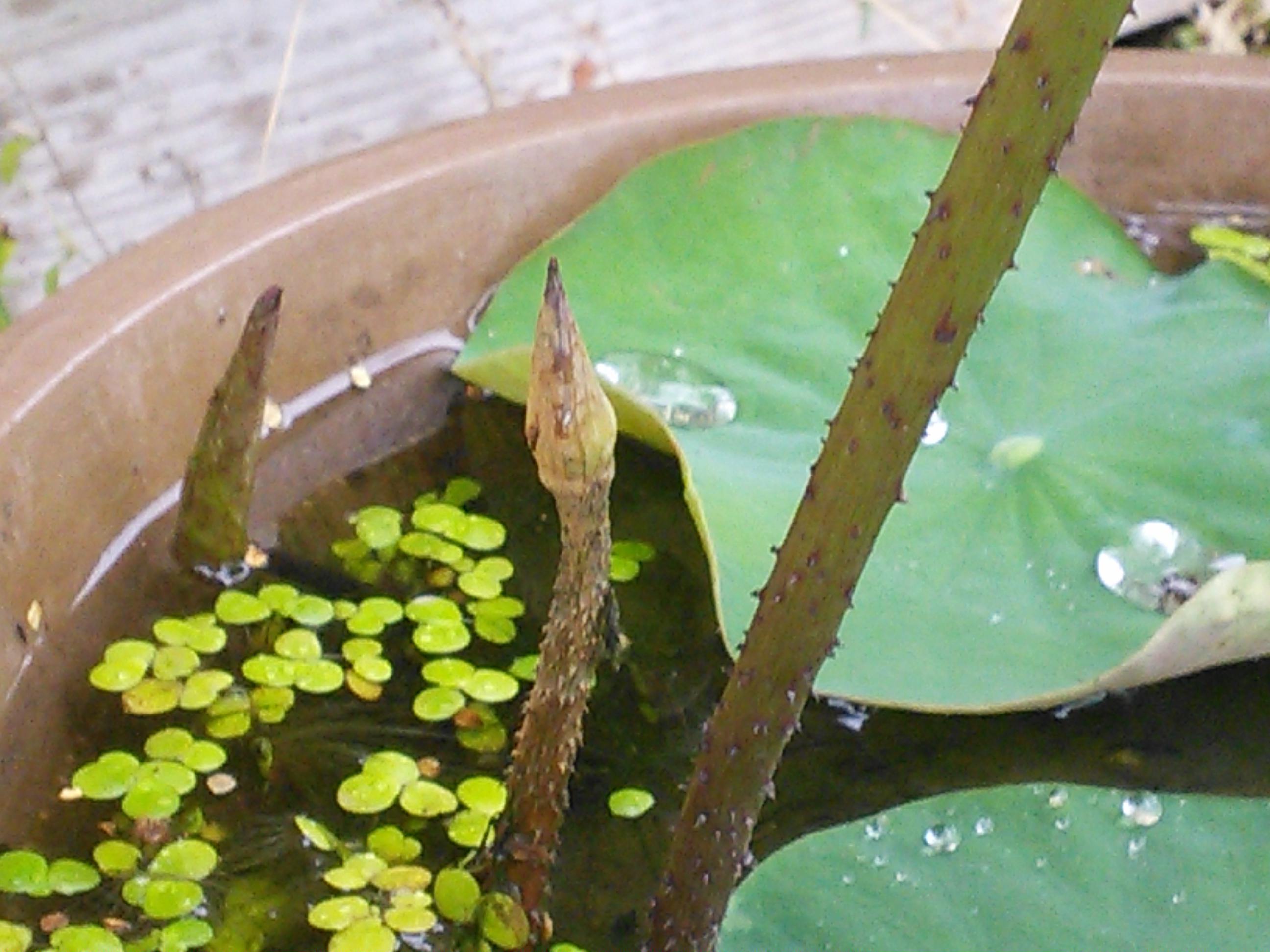 22. 昨春、生蓮寺様植替講習会でいただいた蓮苗、今春は植替えをしなかったのですが、早くも花芽を出してくれました。