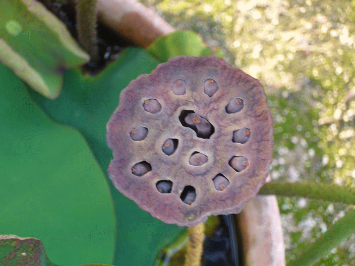 先の果托(写真左下)は、中の種子の成長が止まってしまったようです。周囲に他のハスの花はありませんので、自家受精では、種子が成長しないのでしょうか。kyj